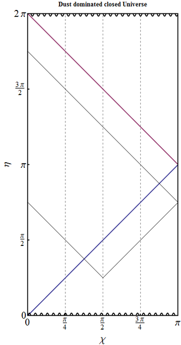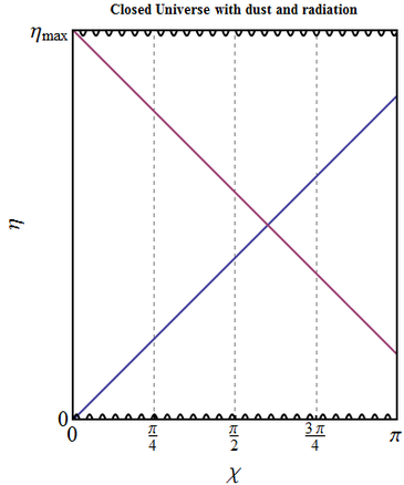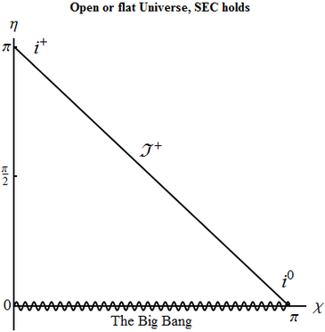 Consider open or flat Universe filled with matter that satisfies strong energy condition $\varepsilon +3p>0$. What are the coordinate ranges spanned by the comoving coordinate $\tilde{\chi}$ and conformal time $\tilde{\eta}$? Compare with the Minkowski metric and construct the diagram. Identify the types of infinities and the initial Big Bang singularity.