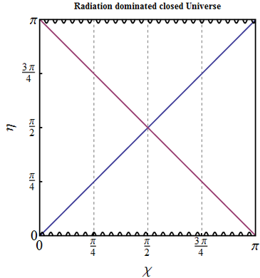 In terms of comoving distance $\tilde{\chi}$ and conformal time $\tilde{\eta}$ (in this section they are denoted by tildes) the two-dimensional radial part of the FLRW metric takes form \begin{equation} ds_{2}^{2}=a^{2}(\tilde{\eta})\big[d\tilde{\eta}^2 -d\tilde{\chi}^2\big]. \label{ds2Dconf} \end{equation} In the brackets here stands the line element of two-dimensional Minkowski flat spacetime. Coordinate transformations that preserve the \emph{conformal} form of the metric \begin{equation*} ds_2^2 =\Omega^{2}(\eta,\chi)\big[d\eta^2 -d\chi^2 \big], \end{equation*} are called conformal transformations, and the corresponding coordinates $(\eta,\chi)$ -- conformal coordinates.