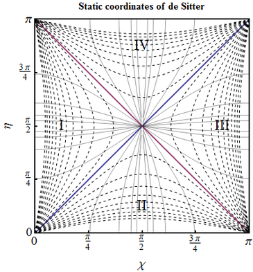 Static dS. Rewrite the metric of de Sitter space (\ref{dSclosed}) in terms of "static coordinates" $T,R$: \begin{equation} \tanh (H_\Lambda T)=-\frac{\cos\eta}{\cos\chi},\qquad H_\Lambda R =\frac{\sin\chi}{\sin\eta}. \end{equation}
